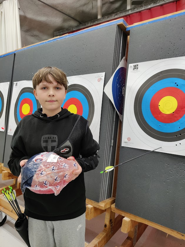 Maunulan hallilla 22.12. käytyyn Artemiksen perinteiseen kinkkukisaan saatiin vuosituhannen ensimmäinen juniorivoittaja. Atte Heikkilä vei kinkun 16. kierroksella, kun kisassa toisena kilpailijana mukana ollut Olli Haavisto ampui parillisen lopputuloksen. Kuvassa onnellinen voittaja ja kisan ratkaissut nuoli. Tänä vuonna kinkkua tavoitteli 16 jousiampujaa.