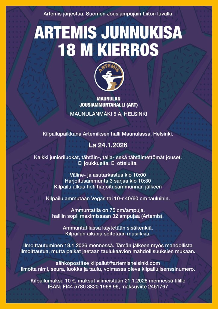 Helsinkiläinen jousiammuntaseura Artemis järjestää 24.1.2026 klo 10.00 alkaen 18m / 60 nuolen kansallisen peruskilpailun Maunulan jousiammuntahallilla. Halli varattuna kilpailulle klo 8.00- n. 16.00.
